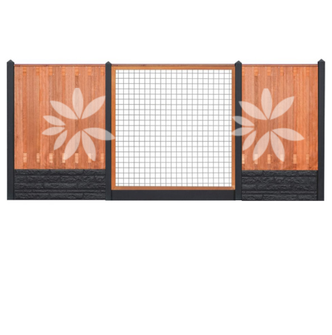 De schutting is van het merk Tuindeco. Dit hout-beton scherm heeft standaard 19+2 (21 planks) hardhout en is RVS geschroefd .