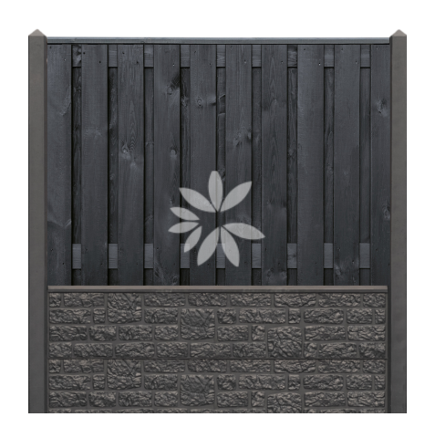 De schutting is van het merk Tuindeco. Dit hout-beton scherm heeft standaard 19+2 (21 planks) grenen en is RVS geschroefd. Dit scherm is geimpregneerd en zwart gespoten.