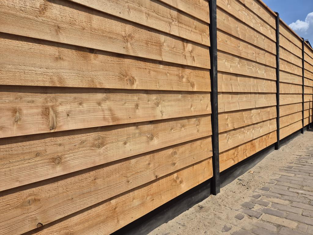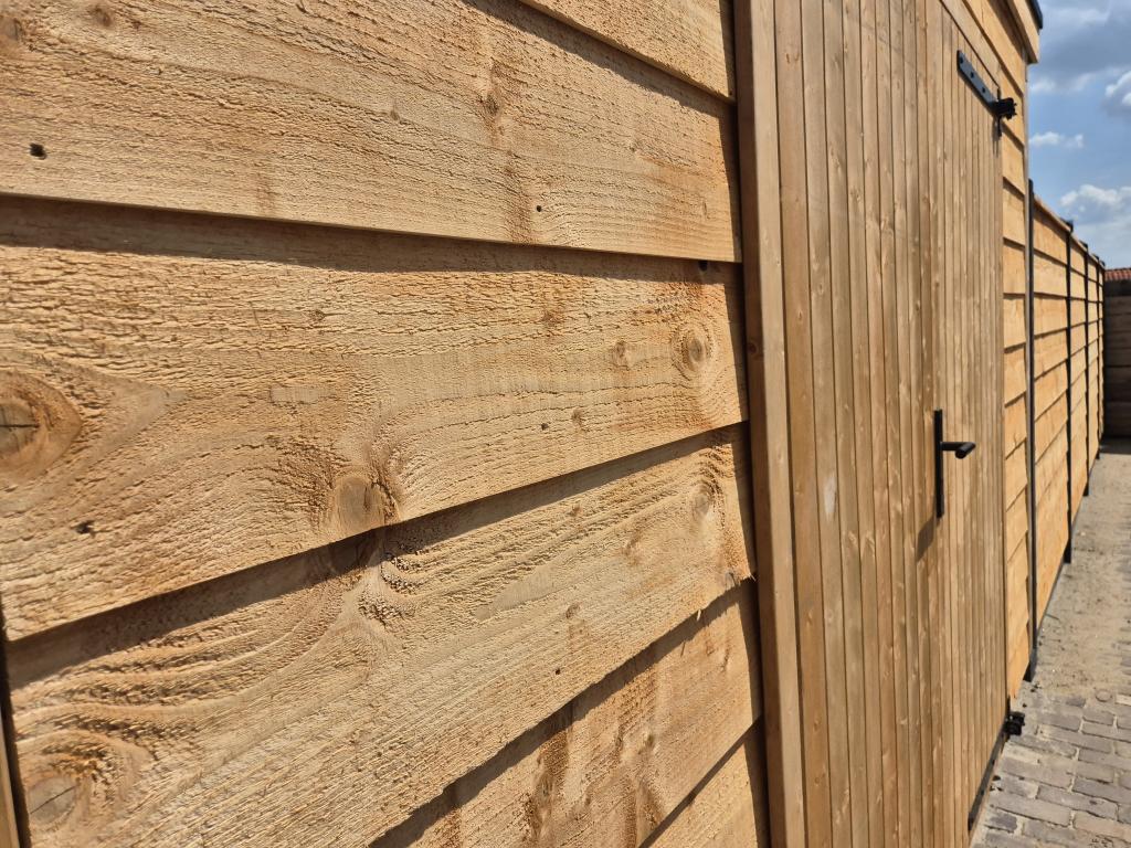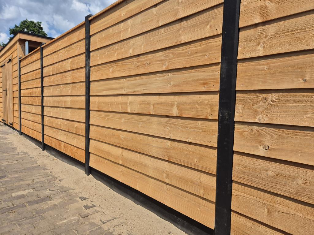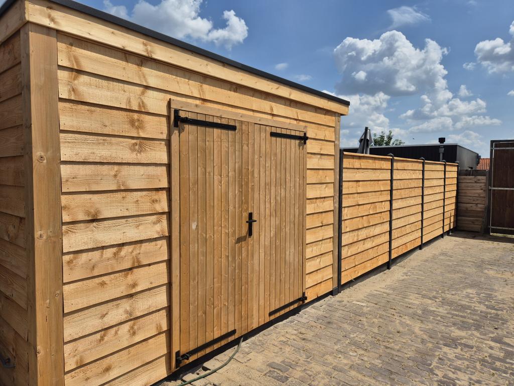 Deze combinatie van een red class wood schutting OP MAAT met potdeksel planken en een gecoat betonsysteem zijn zeer handig als je als buren toch een andere smaak hebt. De schutting kan namelijk aan 2 kanten bekleed worden met dezelfde of met 2 verschillende soorten planken. Bij deze schutting is gekozen voor gladde onderplaten. Ook hebben we hier een carport gecombineerd met een tuinkamer mogen plaatsen inclusief grond en straatwerk!