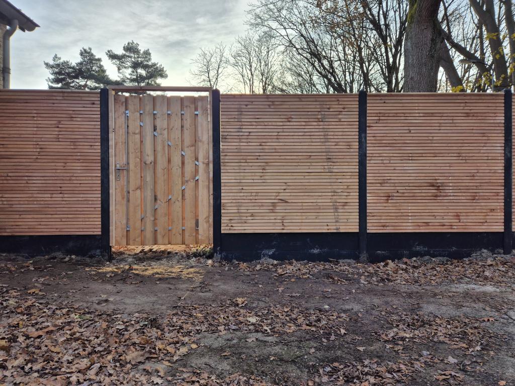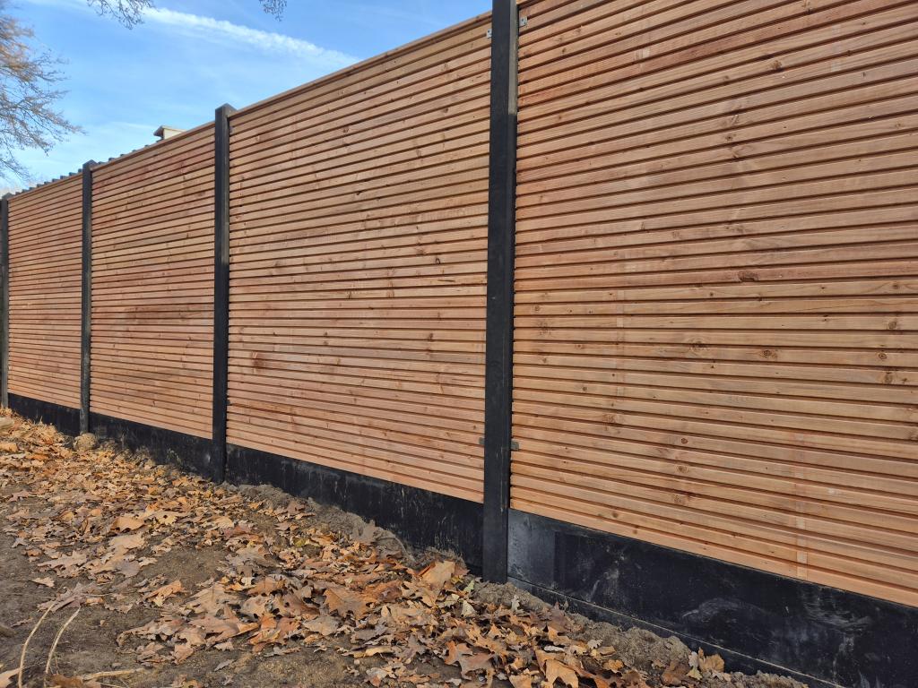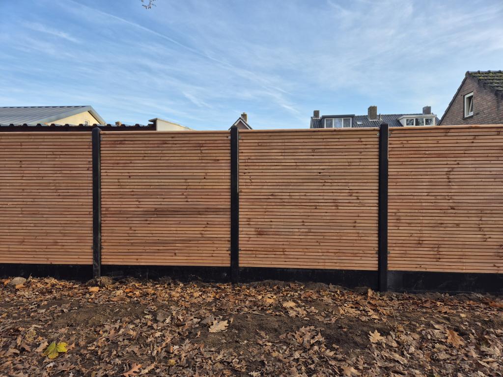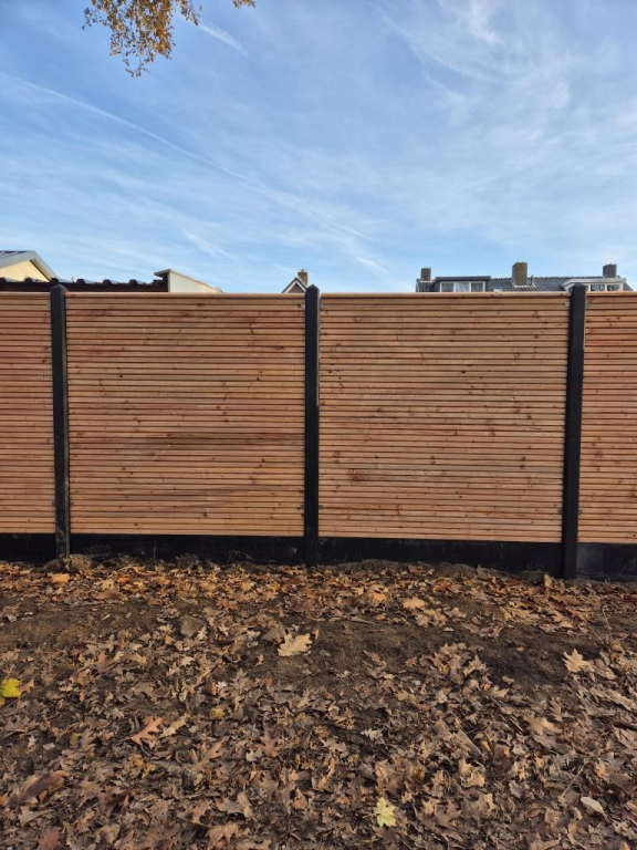 Deze combinatie van een red class wood schutting OP MAAT met triple profiel planken en een gecoat betonsysteem zijn zeer handig als je als buren toch een andere smaak hebt. De schutting kan namelijk aan 2 kanten bekleed worden met dezelfde of met 2 verschillende soorten planken. Bij deze schutting is gekozen voor dubbele gladde onderplaten ± 45cm hoog.