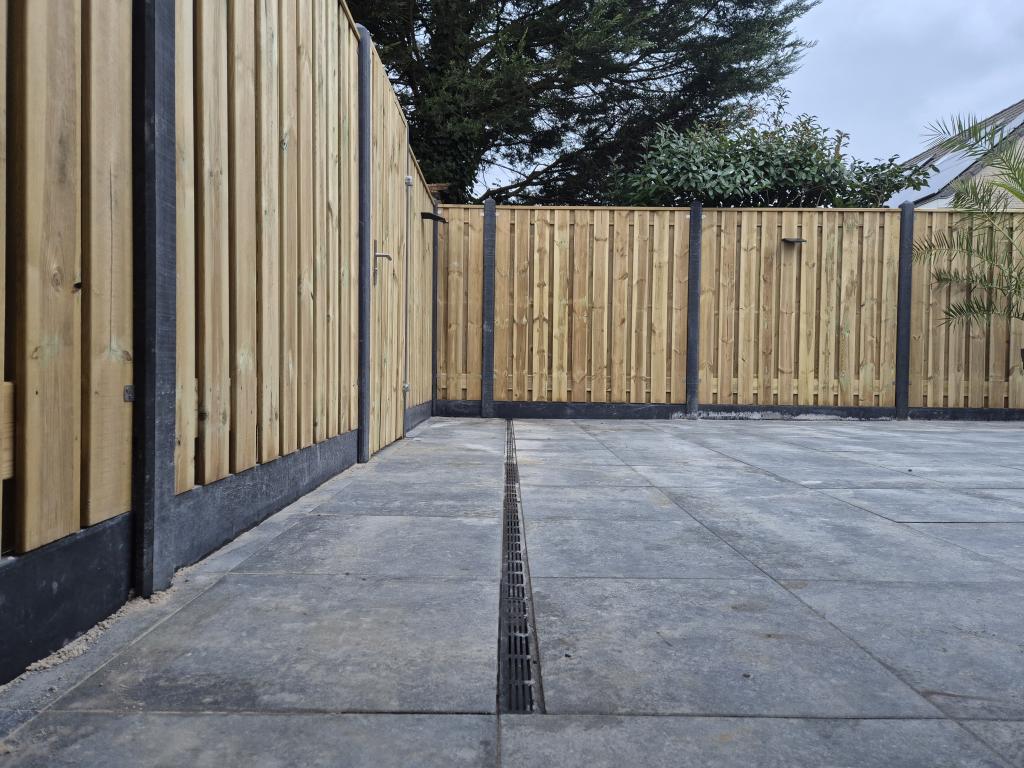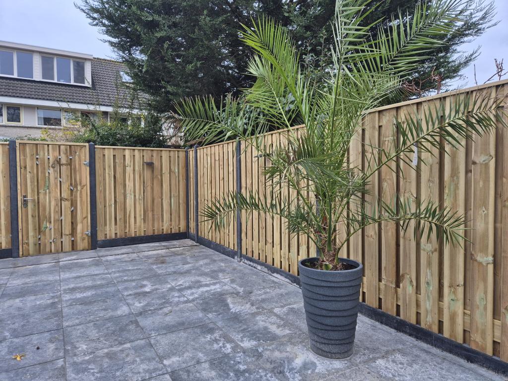 Deze duurzame en stevige combinatie van een grenen tuinscherm geïmpregneerd Enschede van 180x180cm en een antraciet betonsysteem gaat heel wat jaren mee! Bij deze schutting is gekozen voor een gladde onderplaat van ± 20cm hoog.