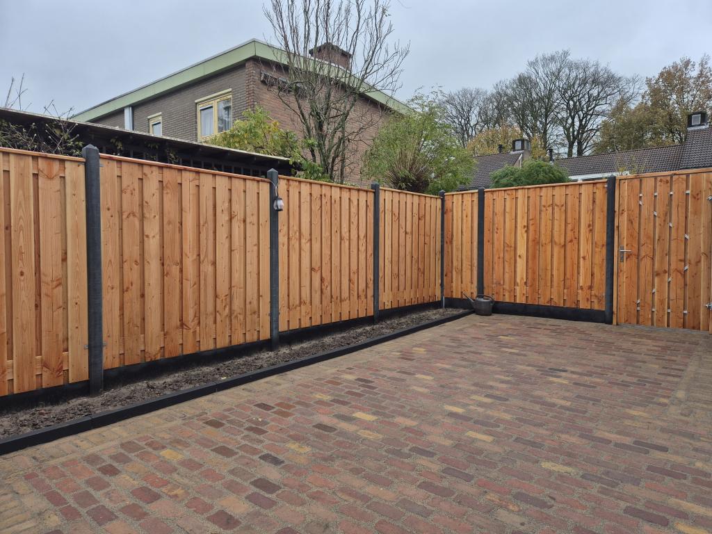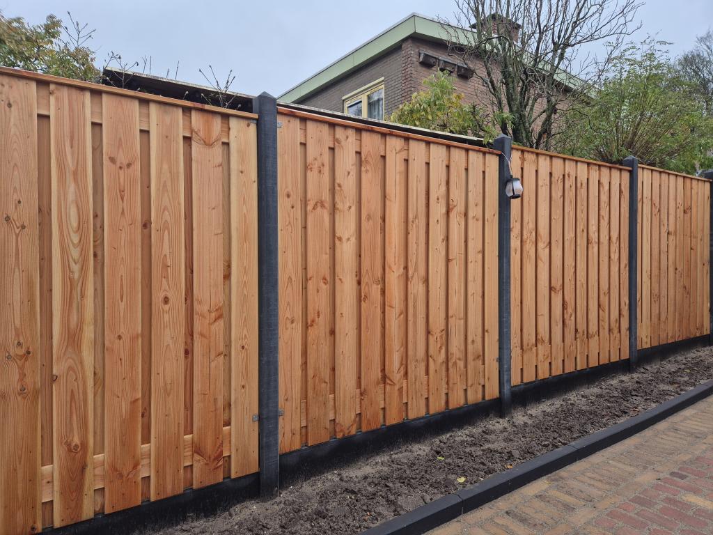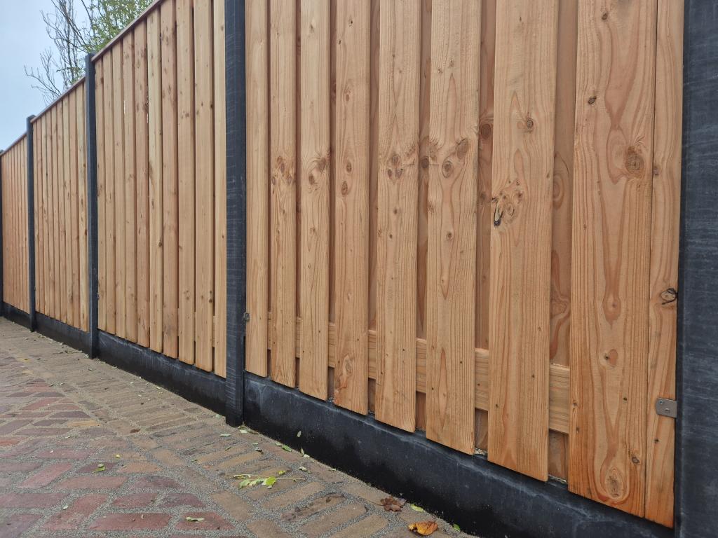 Deze duurzame en stevige combinatie van een lariks douglas tuinscherm Zwarte Woud en een antraciet betonsysteem gaat heel wat jaren mee! Bij deze schutting is gekozen voor een gladde onderplaat van ± 20cm hoog.