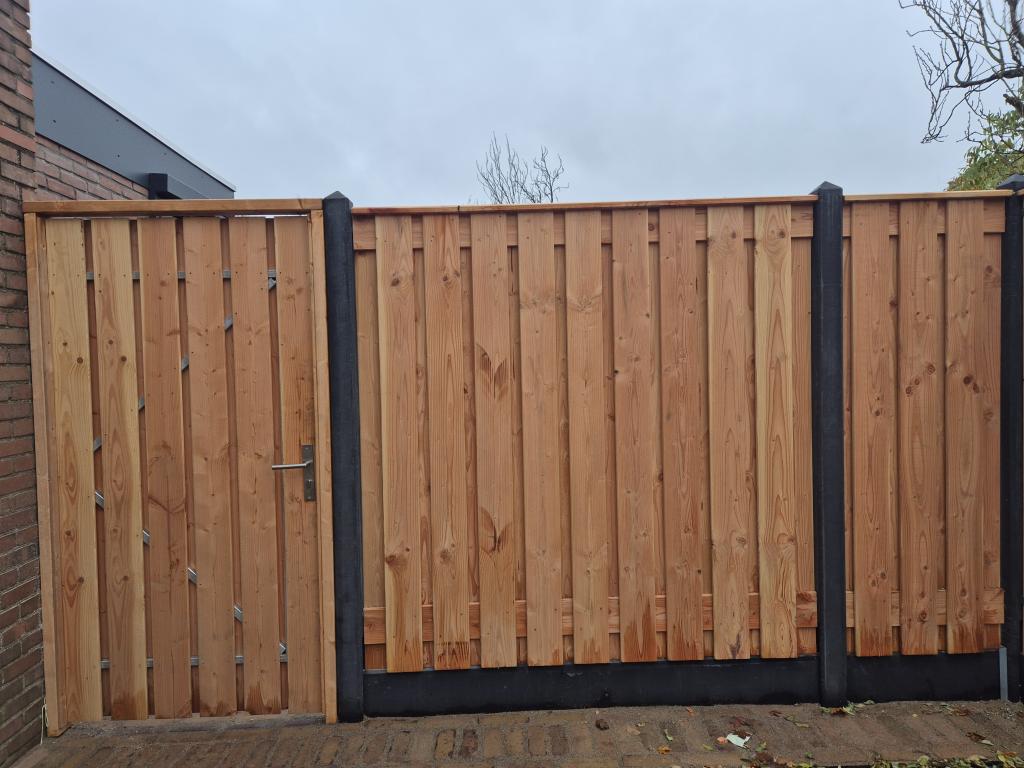 Het is fijn als je de tuin af kan sluiten met een goede stevige tuindeur met cilinderslot en verstelbare duimen. Er niks zo vervelend dan een poort die niet goed sluit of blijft klemmen. Deze lariks douglas tuindeur van 100x195cm op een stalen frame is de meest stevige houten tuindeur die er is. Er is ook geen doorkijk en dat maakt dat deze tuindeur perfect past tussen een hout-beton systeem schutting in.