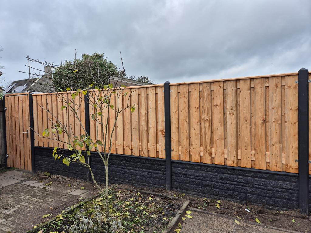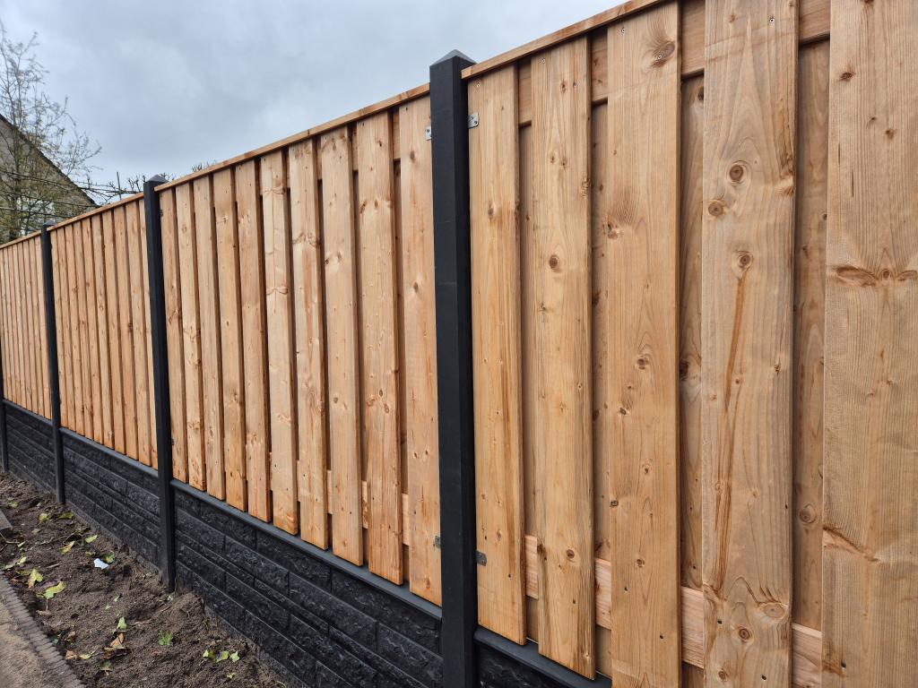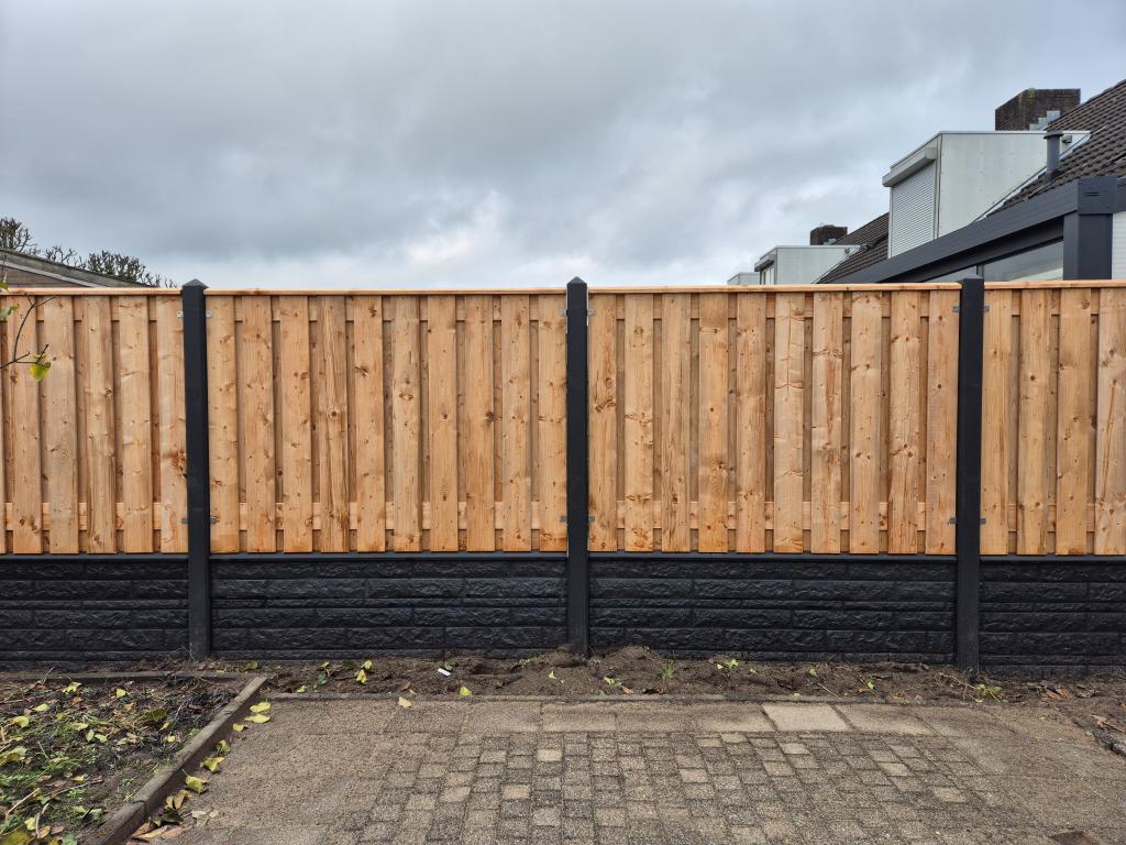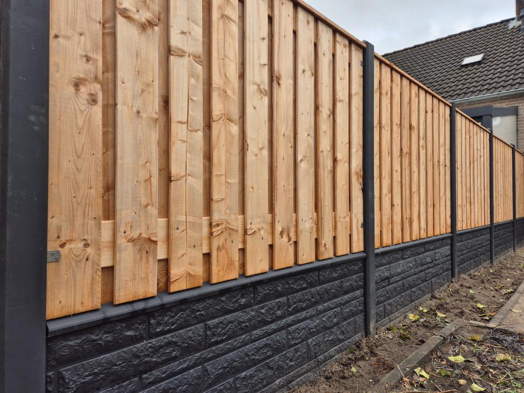 Deze duurzame en stevige combinatie van een red class wood tuinscherm Casablanca en een gecoat betonsysteem gaat heel wat jaren mee! Bij deze schutting is gekozen voor rotsmotief onderplaten van ± 70cm hoog.