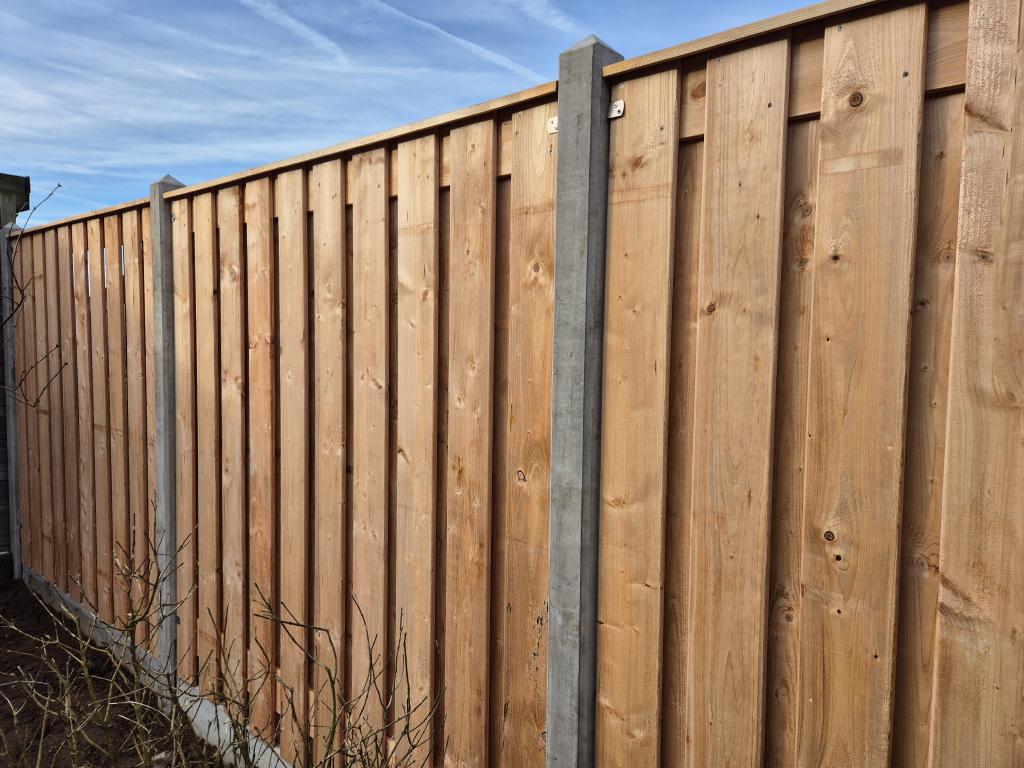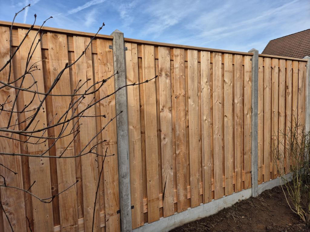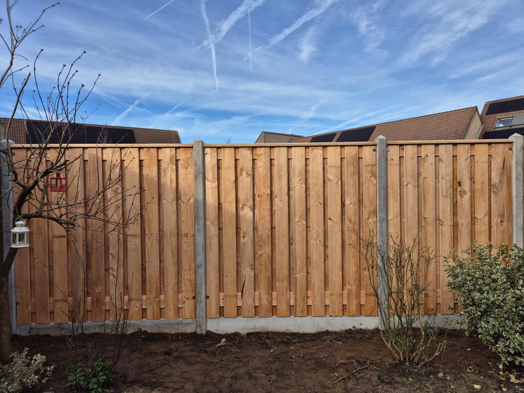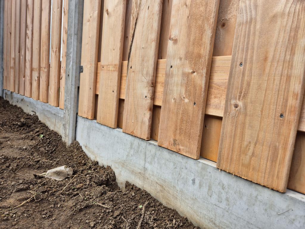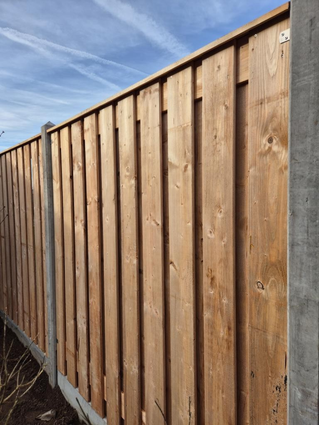 Deze duurzame en stevige combinatie van een red class wood tuinscherm Casablanca en een wit/grijs betonsysteem gaat heel wat jaren mee! Bij deze schutting is gekozen voor een gladde onderplaat van ± 20cm hoog.