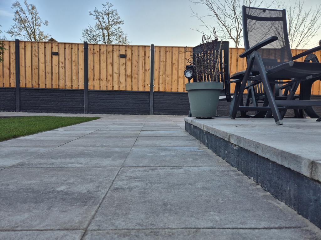 · Schutting: red class wood met antraciet beton en rotsmotief onderplaten