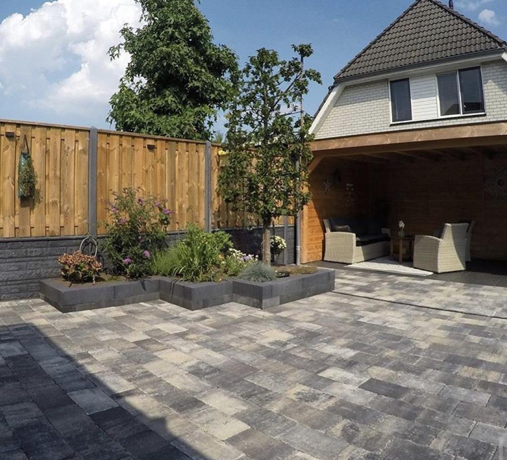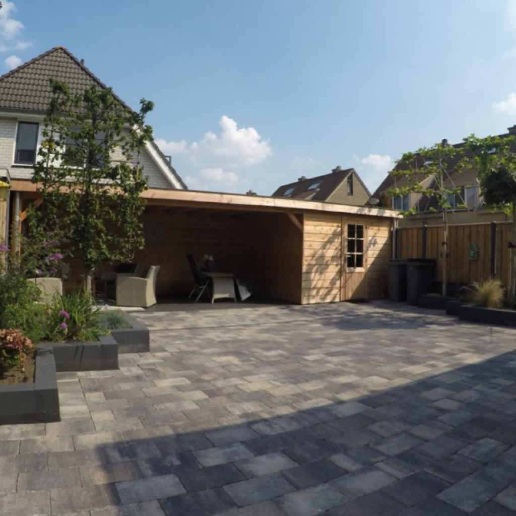 · Straatwerk: keramische tegels 60x60cm (overkapping) en abbeystones 20x30cm