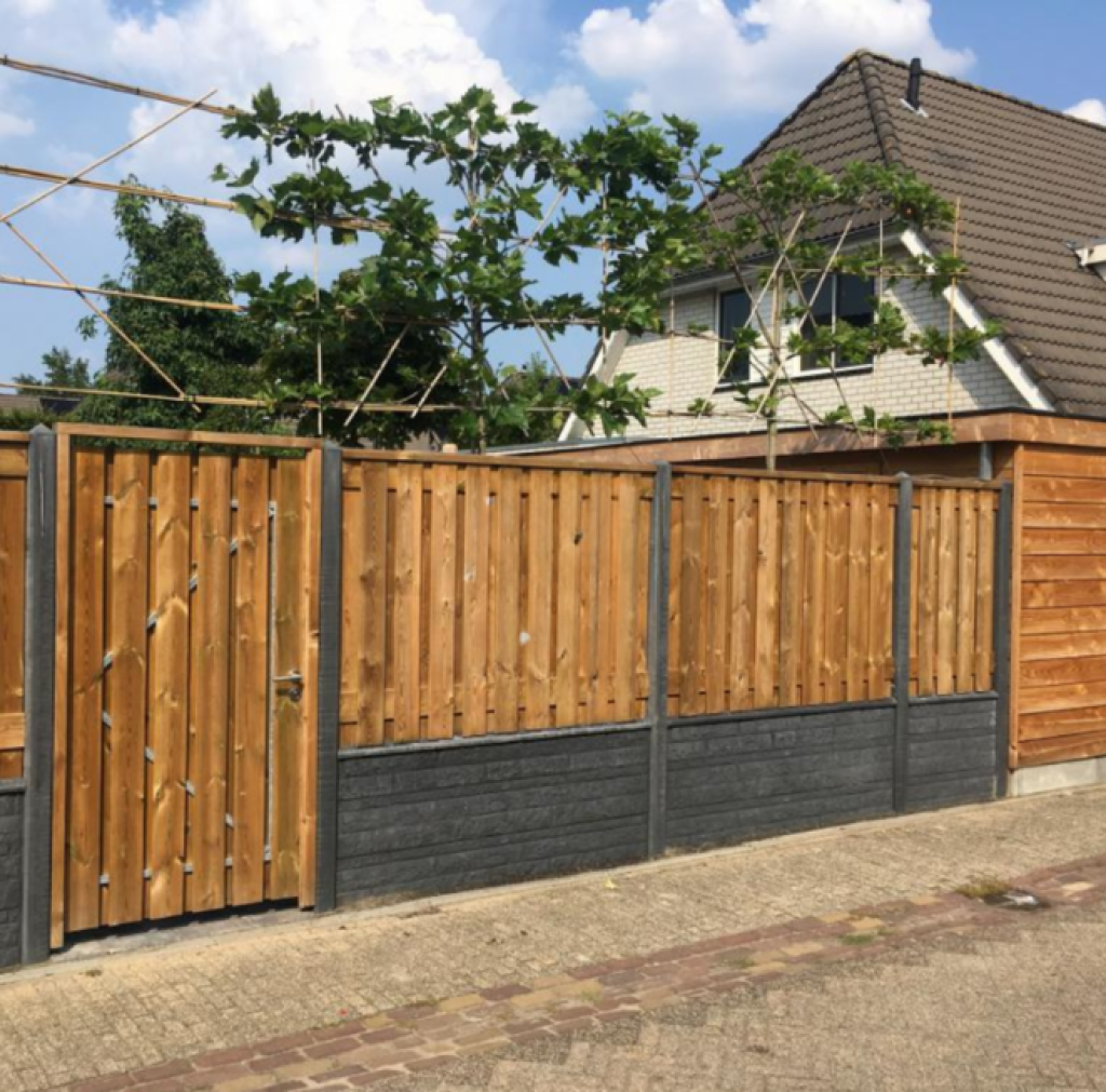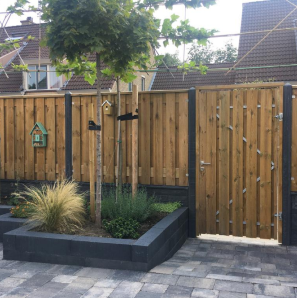 · Schutting: grenen 130x180cm met rotsmotief onderplaten antraciet en een poort