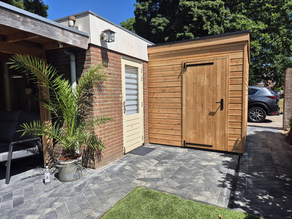 TUINAANLEG | aanleg achtertuin met een Lariks Douglas tuinhuisje