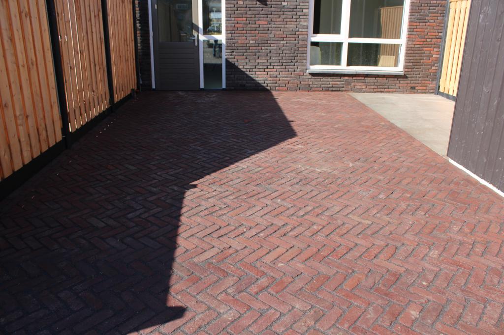 Het bijzondere van deze tuin is dat de oude gebakken dikformaten gevoegd zijn zodat ook hier geen onkruid door heen komt net als bij de keramische tegels!