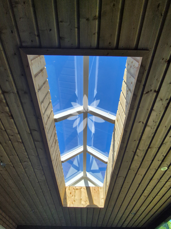 § Het dak van de overkapping is aan de binnenzijde afgetimmerd met dakplanken