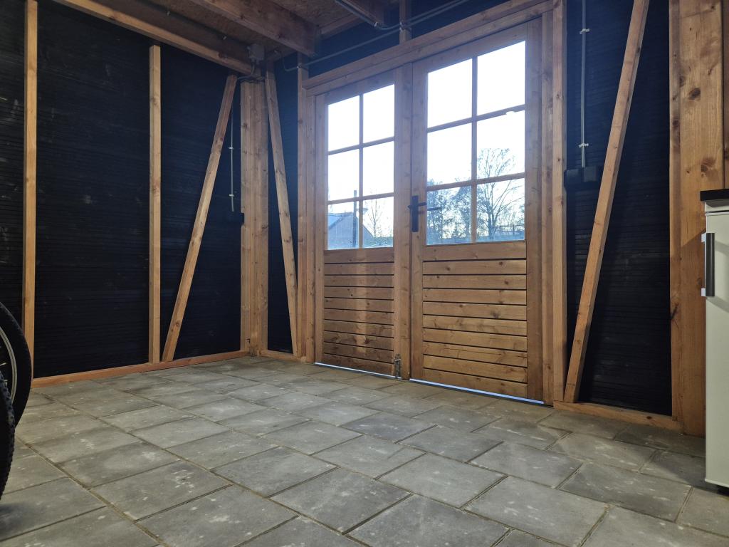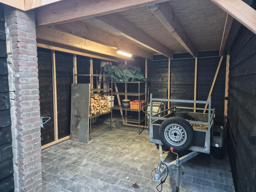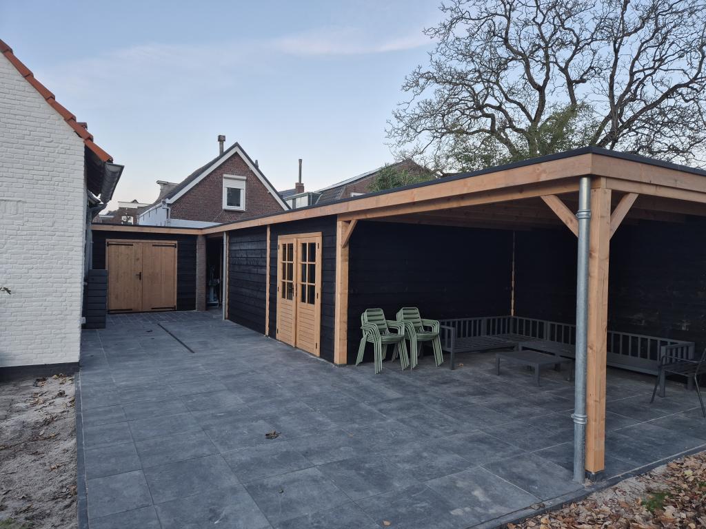 Het maatwerk tuinhuis met twee overkappingen en een carport bestaat uit: