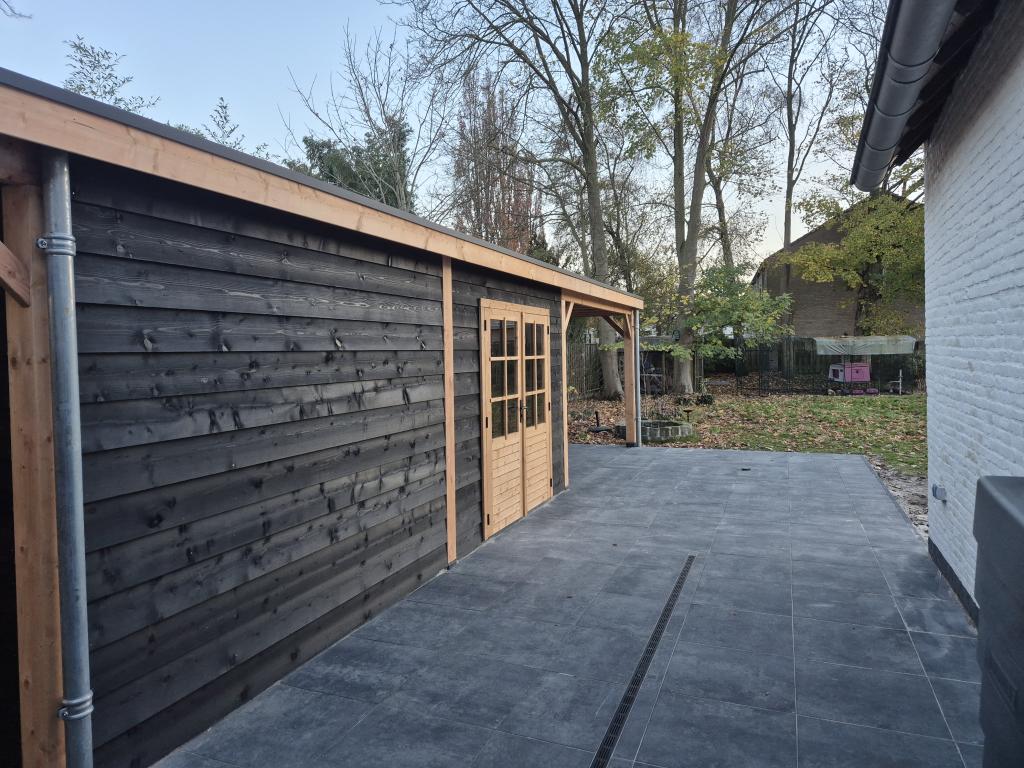 Dit moderne tuinhuis in combinatie met twee overkappingen en een carport is ideaal voor de grotere tuinen. In het zit gedeelte kun je samen lekker borrelen, buiten eten of gewoon samen genieten tot laat in de avond. Naast het zit gedeelte kun je in het tuinhuis al je tuingereedschap en /of tuinkussens etc. op bergen. Aan de linkerkant naast het tuinhuis is er ruimte voor bijvoorbeeld je aanhanger. En daarbij kun je ook nog fijn je auto in de carport kwijt. Met dit maatwerk tuinhuis met twee overkappingen en een carport is het allemaal mogelijk! Het mooie van dit project is dat wij het grondwerk hebben verzorgd met daarbij de afwatering en het straatwerk!