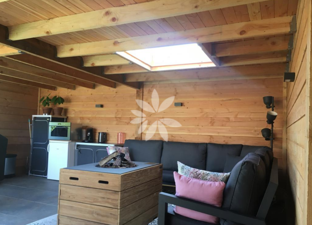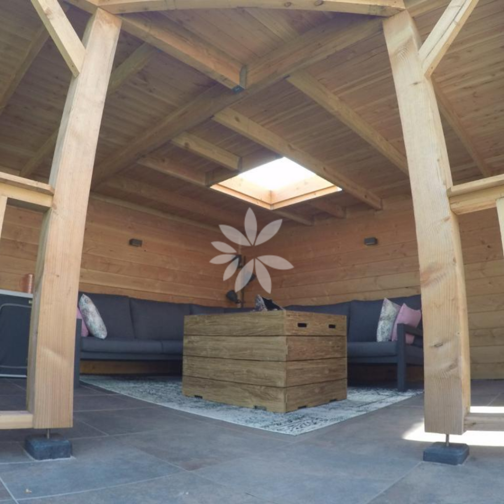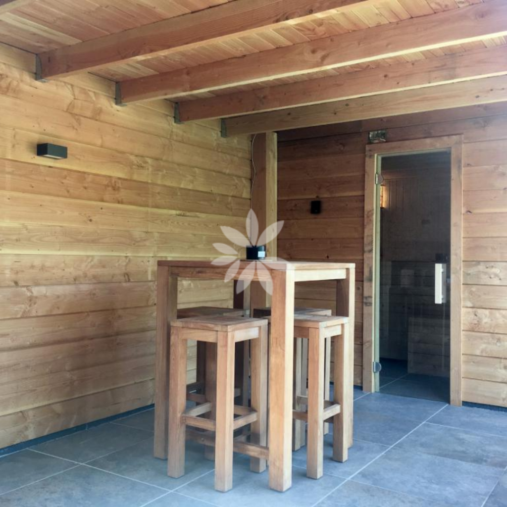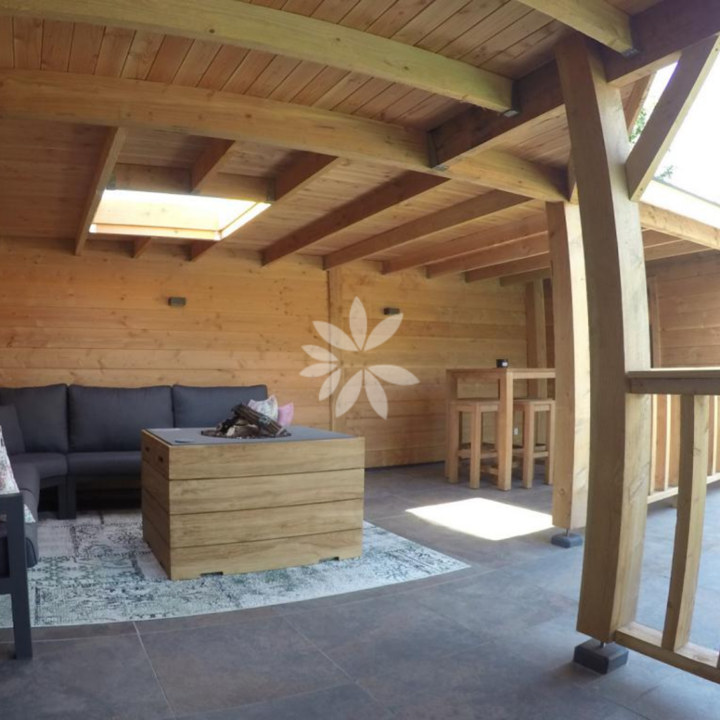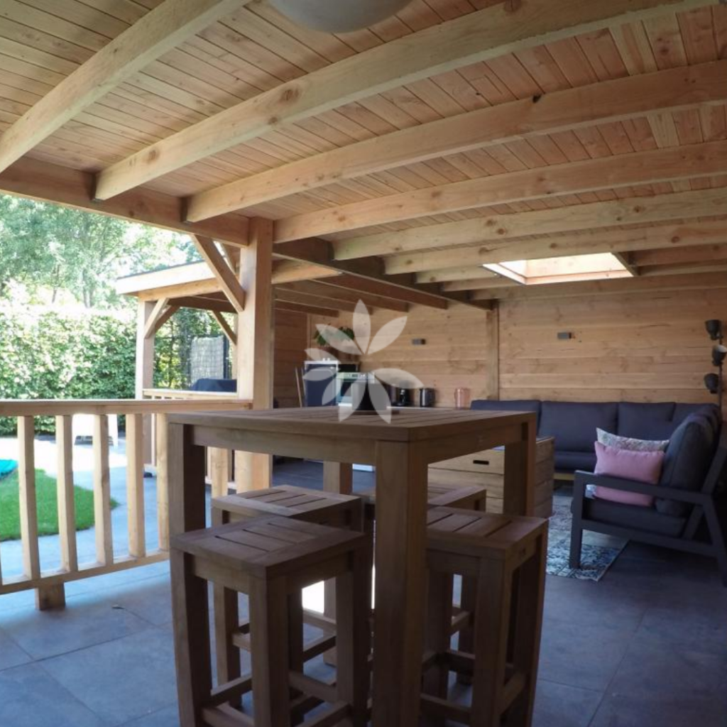 Het maatwerk tuinhuis/overkapping met sauna bestaat uit: