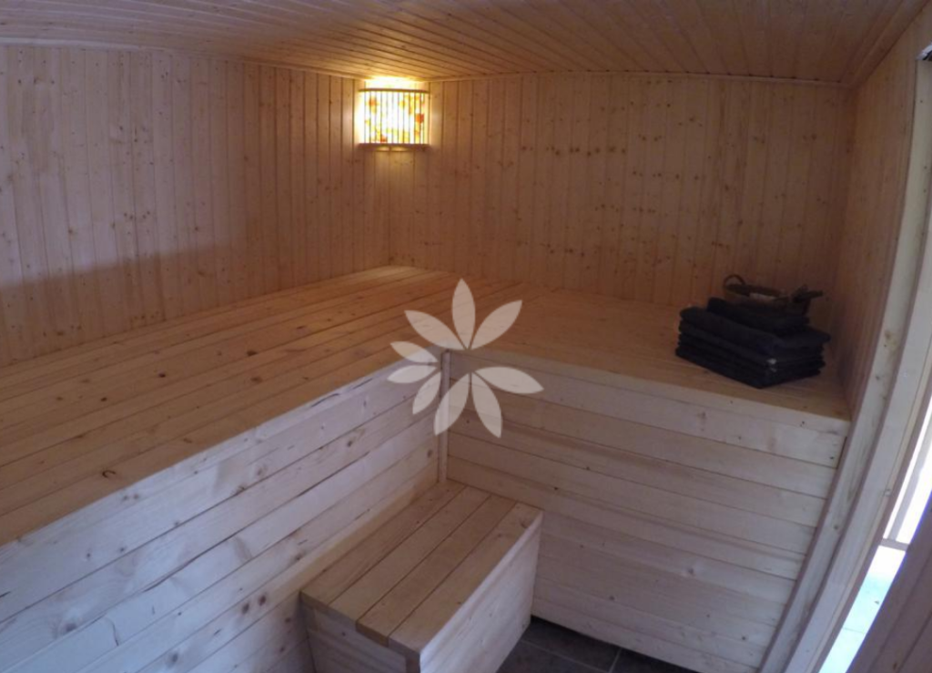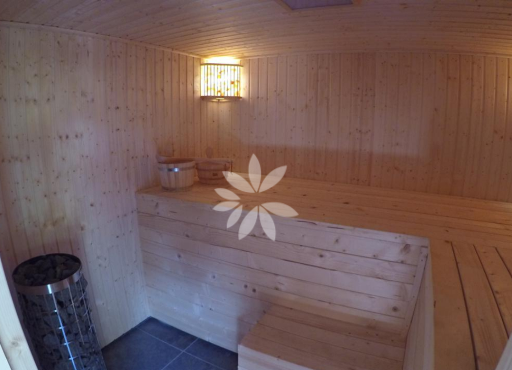 § Wanden: lariks douglas rabatdelen dubbelwandig en thermowood (saunahout)