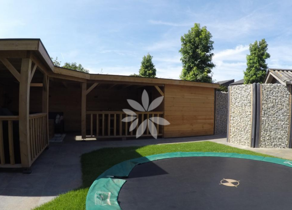 Dit moderne tuinhuis/overkapping in combinatie met sauna is ideaal voor alle gezinstuinen. Samen lekker borrelen, buiten eten of gewoon samen genieten tot laat in de avond. Onder deze overkapping is het allemaal mogelijk! Daarnaast kun je nog lekker even ontspannen in de sauna! Het mooie van dit project is dat wij het hele plaatje compleet hebben verzorgd! Zoals het grond en straatwerk en de schanskorven! Een super mooi eindresultaat!